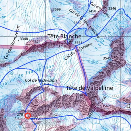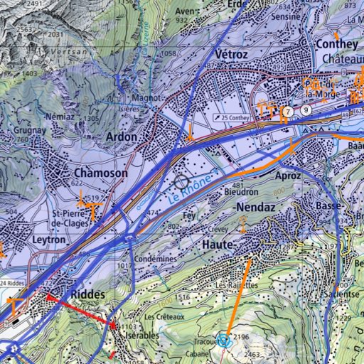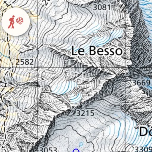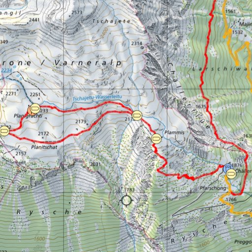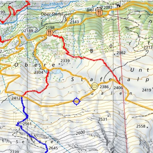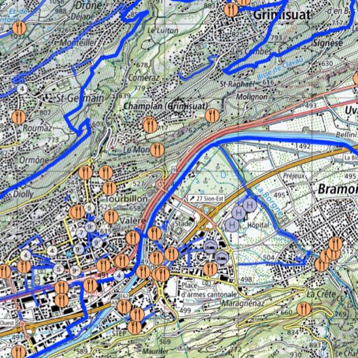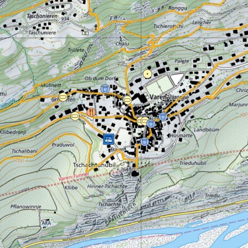 "swisstopo"-Kartenblatt, SAC-Hütten, Wegnetz, Flurnamen, Trinkwasser und Unterstände, sowie vieles mehr, können angezeigt werden.