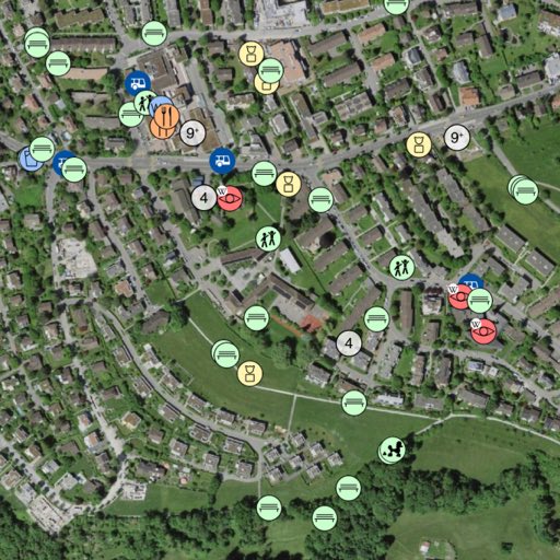 Spielplätze, Sitzbänke, Burgruinen, Sehenswürdigkeiten und auch die Berg- und Seilbahnen des öffentlichen Verkehrs.