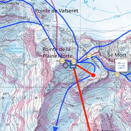 Routen für Ski- und Schneeschuhwanderungen, Schlittelwege, Loipen und Winterwanderungen von SchweizMobil, Hangneigung, Hanggneigungsklassen, Wildschutzgebiete, Wildruhezonen und weitere nützliche Informationen wie Fahrpläne und Restaurants.