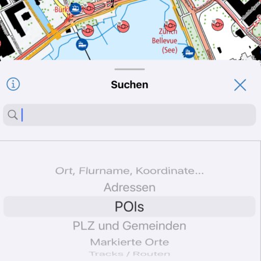 Suche nach Orts- und Flurnamen, Gemeinden, POIs, Koordinaten, Adressen und SchweizMobil-Routen. Dies alles selbstverständlich auch offline, ausser bei der Suche weltweit.