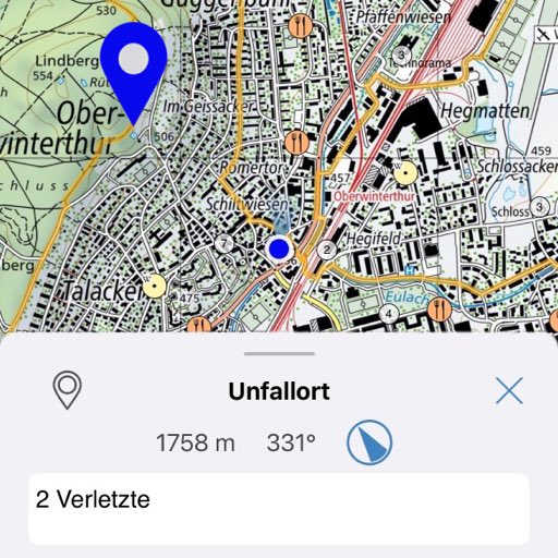 Die aktuelle Position auf der Karte ist jederzeit verfügbar, auch offline, mit der Angabe von Koordinaten und Höhe.