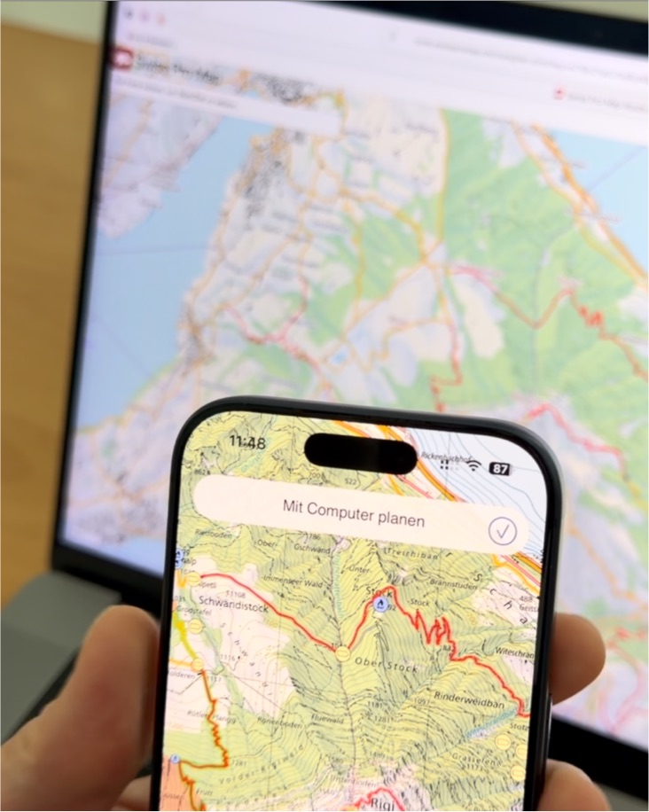 Wählen Sie in dieser Website den Menüeintrag "Routenplaner". Scannen Sie den angezeigten QR-Code mit einem Gerät, auf dem Swiss Pro Map Version 26 oder neuer installiert ist. Die geplante Route wird direkt in der App übernommen.