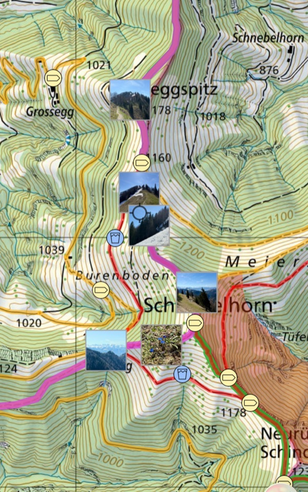 Drücken Sie lange (Long Press) auf eine beliebige Stelle auf der Karte und wählen Sie im Menü "Eigene Fotos einblenden". Swiss Pro Map liest die Standortinformationen Ihrer Fotos aus und platziert sie als Vorschau auf der Karte. Tippen Sie auf ein Foto, um es in voller Grösse zu sehen.