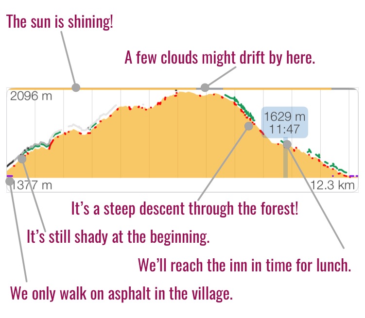 The route profile already tells you in advance what conditions await you on the tour: not only elevation changes, but also forest sections, steep parts and shaded stretches.