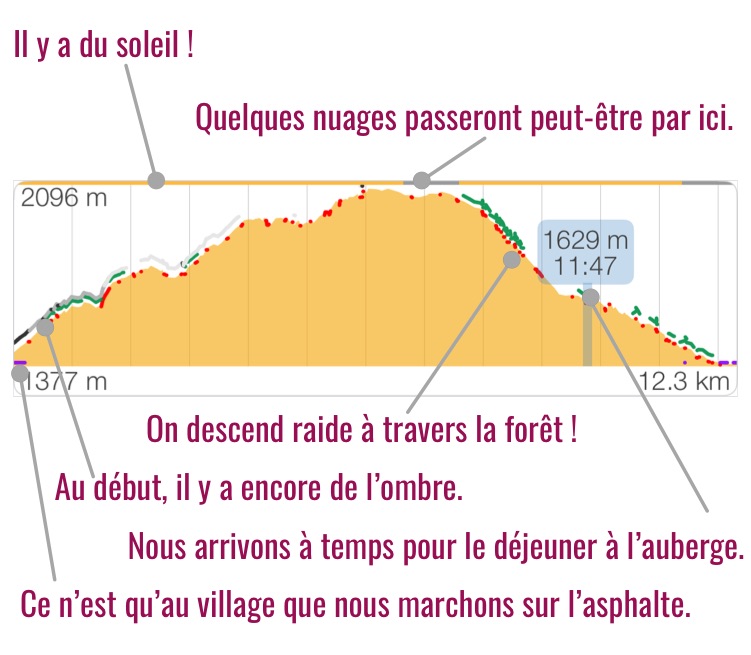 Le profil d’itinéraire vous informe déjà à l’avance des conditions qui vous attendent : non seulement les dénivelés, mais aussi les passages en forêt, les sections raides et les portions ombragées.